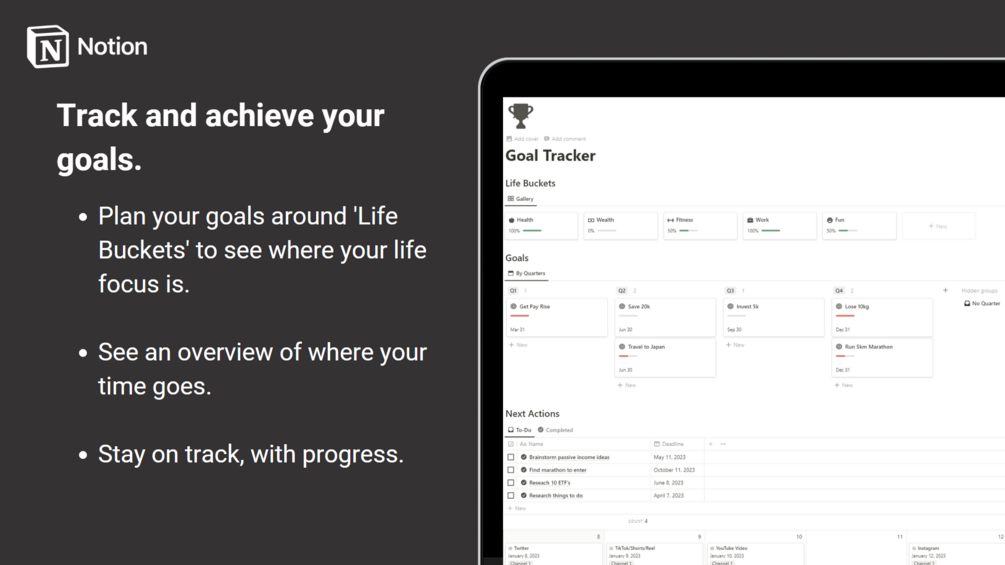 Say hello to this simple Notion Goal Tracker, which overviews your goals, their life buckets, and tasks.