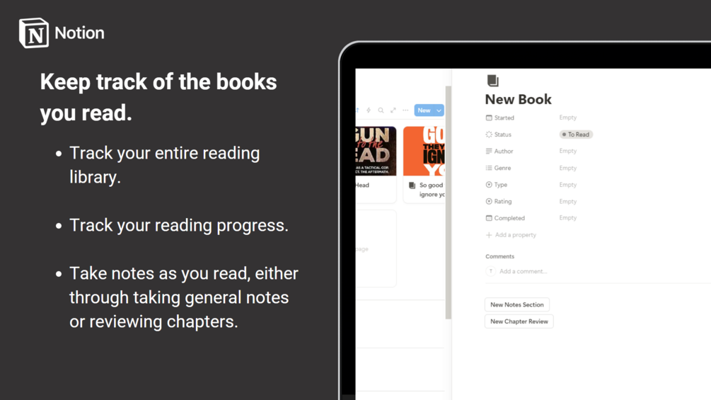 - Started (when you start reading), Status (status of the book progress), Author and Genre (self-explanatory), Type (book, audiobook, ebook, etc), Rating (rate your library), and Completed (the date you complete the book).